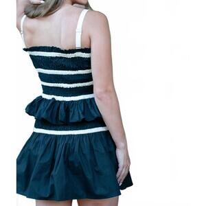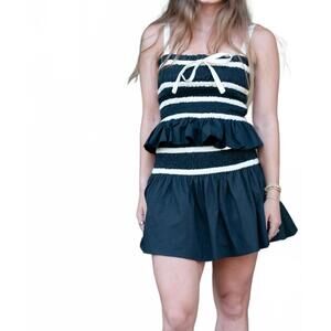 Elevate your summer style with the Hazel Smocked Mini Skirt Set by Aureum, a minimalist loungewear set perfect for beach days. This sleeveless two-piece ensemble features a cotton blend material, offering comfort and breathability with a playful stripe pattern in black and cream. The squat neckline and clever smocking ensure a flattering fit, while the crop top and mini skirt flaunt feminine details like cream ribbon straps, a ruffle hem, and a gathered flounce bottom for graceful movement. Care: Hand wash to maintain the set's pristine quality.
