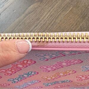 This rare design features a soft pink base with multicolor Barbie logos and a polished gold-tone zipper — equal parts playful and luxe. Pieces from this collab are no longer widely available, making this a standout addition for collectors or anyone curating a chic, Barbiecore aesthetic.