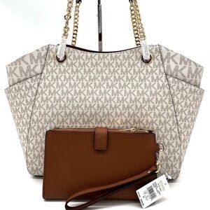 Michael Kors Large Chain Shoulder Bag & Double Zip Wallet Set Vanilla/Luggage