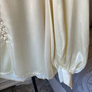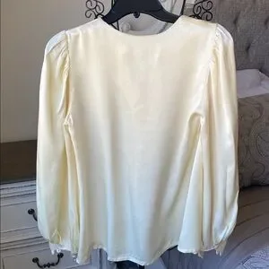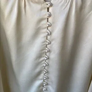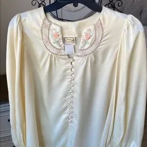 Elegant cream satin blouse featuring delicate floral embroidery on the collar. Soft long sleeves with buttoned cuffs and a pearl-button front closure. Lightweight, silky fabric for a polished, feminine look. Perfect for dressy occasions or refined everyday wear. Size Small. Pit to pit 17”. Shoulder to Shoulder 13 1/2”. Sleeves 25”. Length 25 1/2”. There is a belt with the top. You decide if you want to use it.