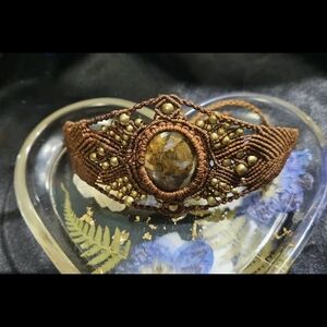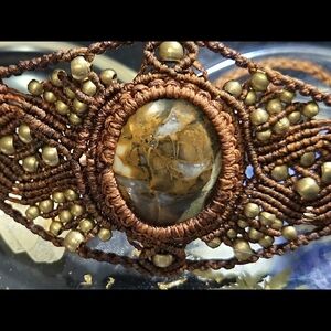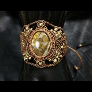 This exquisite, unique, brown macramed artisan bracelet has a lovely detailed design and features an extra- large, natural Brecciated Jasper cabochon and several small, round, brass beads, perfect for elevating any ensemble. A stunning accessory for any occasion.
