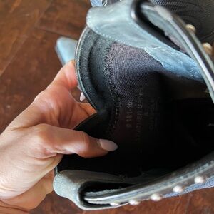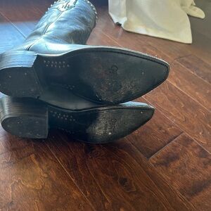 y2k western cowboy boots with studded trim. Embroidered shaft detail. Pointed toe and stacked heel. Versatile blue shade with subtle worn finish.