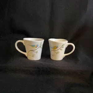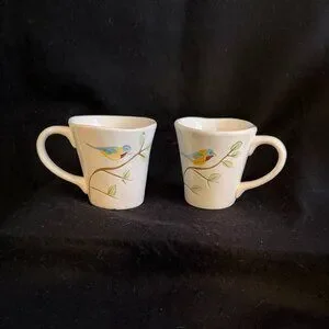 These hand painted earthenware mugs have a ‘wavy’ rim that gives them a fun, unique look. The hand painted blue bird/robin is shown on a branch (The branch has a slight grove to give it depth. They are microwaveable and dishwasher safe.