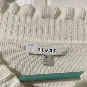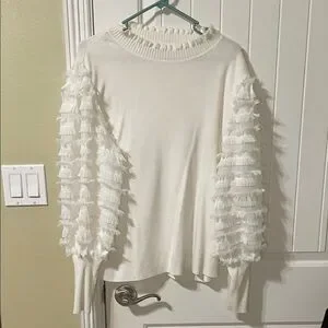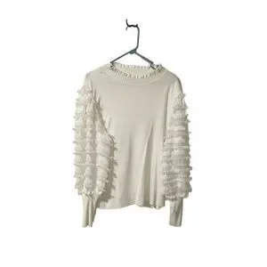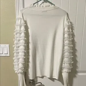 Chic cream sweater by Sioni. Features unique fringe sleeves. Ideal for versatile styling.