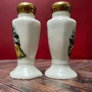 This vintage 1950s souvenir salt & pepper shaker set showcases Colonial-era imagery, including iconic depictions of George and Martha Washington, and Colonial couple figures. These charming pieces offer a functional yet historical nod to the Colonial period in American history.