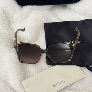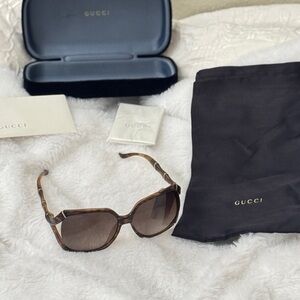 Stylish Gucci sunglasses with a tortoiseshell frame. Perfect for adding elegance to any outfit.