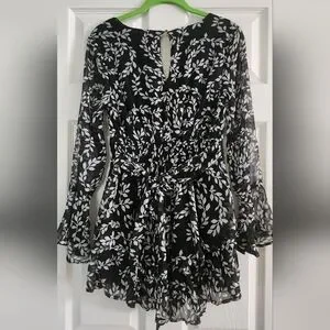 Beautiful romper has a one botton closure and ties in the back. Size Small.