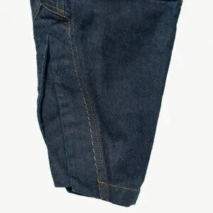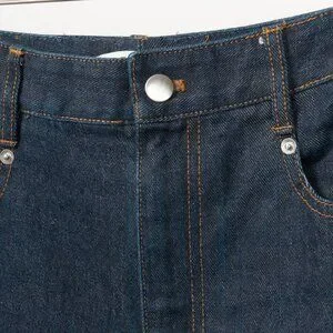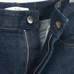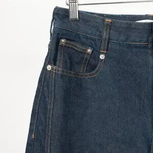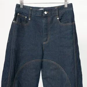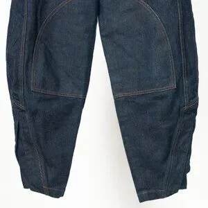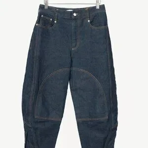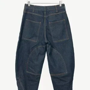 Inspired by the classic jodhpur design merging vintage appeal with modern functionality, these 5-pocket Earl jeans from Tibi's 2025 Spring and Summer collection are crafted with a non-stretch denim in an indigo Dark Denim wash, and feature a front button and zip fly, belt loops, front curved pockets with a right change pocket, back patch pockets, knee patches, barrel legs, and side vents.