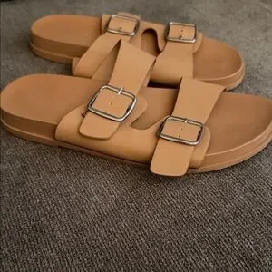 Casual slide sandals with two adjustable buckled straps. Smooth tan faux-leather upper. Cushioned footbed for everyday wear. Silver-tone buckles add subtle shine.