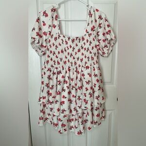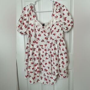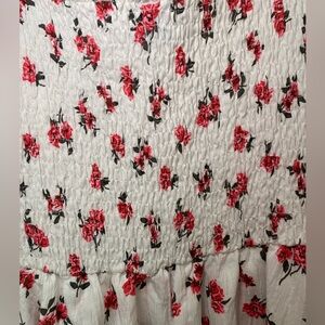 White romper playsuit with scattered red rose print. Puff sleeves and a smocked bodice. Sweetheart neckline. Flowy layered skirt for a feminine look. Perfect for Spring and Summer 🌹☀️