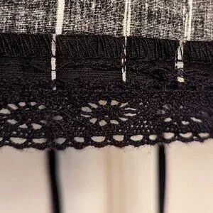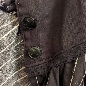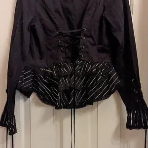 NWOT, hard to find, collectible Disney Hot Topic brand 'Nightmare Before Christmas' Jack Skellington themed jacket in black and white stripes, with multi layered ruffle and corset-style adjustable detail on the back and sleeve cuffs, with long ribbon laces. This sought after Nightmare B4 Xmas (NBC) collectible women's jacket is in perfect new without tags condition, size medium. An awesome goth wardrobe piece and a great Tim Burton / NBC Disney collectible!