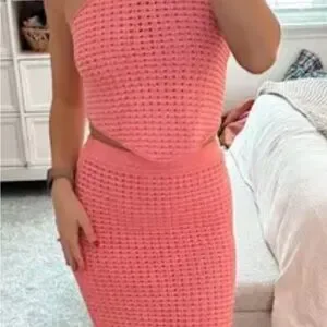 Gianni Bini crochet two-piece featuring a halter-style top and matching skirt. Lightweight open-weave crochet fabric. Vibrant coral hue for warm-weather looks.