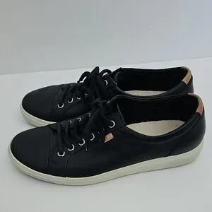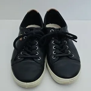 Chic black leather sneakers with lace-up design. Comfortable and stylish for everyday wear. ECCO BLACK LEATHER SNEAKERS. SIZE 9 EXTRA WIDTH. VERY NICE USED CONDITION. MINIMAL OUTSIDE WEAR. SOME WEAR INSIDE FROM USE.