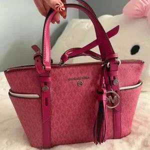 Stylish fuchsia satchel by Michael Kors. Features elegant tassel and signature logo charm. Ideal for versatile use.