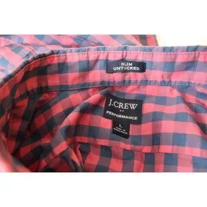 The J.Crew Performance Men's L Slim Untucked Long Sleeve Shirt is a classic and versatile button-up shirt made from woven cotton fabric with a plaid pattern in red color. It features a collared neckline, button closure, and slim fit, making it suitable for various occasions such as travel, parties, formal events, and business meetings. The shirt is machine washable and includes accents like button detailing and pockets, perfect for year-round wear in all seasons. With its quality brand and timeless style, this shirt is a great addition to any man's wardrobe.