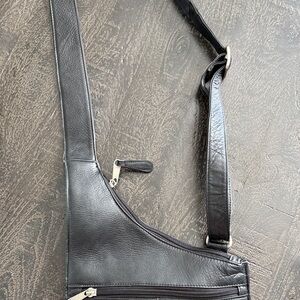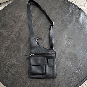 Elegant black leather crossbody bag. Ideal for daily use. Features multiple pockets for organization.
