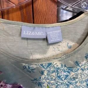 Liz & Me lightweight scoop neck top featuring a colorful New York scenic print. Sage green base with vibrant pink, purple, blue and cream accents. Soft drape and relaxed fit for easy layering. Eye-catching graphic details add a playful, city-inspired look.