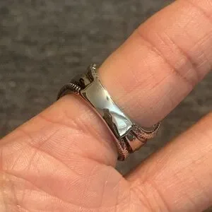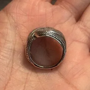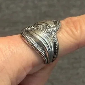 In excellent condition. Bold silver-tone ring featuring an intertwined double knot design. Textured rope detailing contrasts with polished curved segments for eye-catching dimension. Comfortable for daily wear and elevates any outfit with a sculptural metallic finish.
