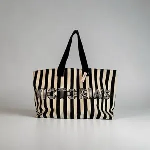 Victoria's Secret striped tote bag. Bold black and white vertical stripes. Large open top with shoulder straps. Casual and versatile style.