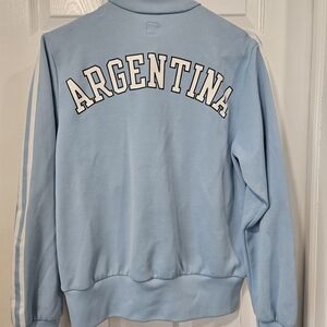 Classic adidas track jacket in light blue. Features AFA crest on chest. White adidas logo and shoulder stripes. Front zip and side pockets. Sporty and clean look.