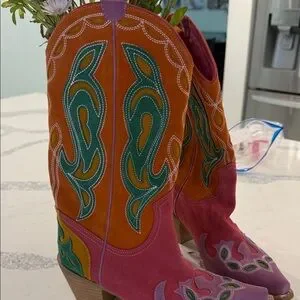 Vibrant pink and orange western boots with teal embroidery for a bold look. Soft suede upper and detailed stitching create standout style. Cushioned insole offers comfortable wear. Eye-catching colors elevate casual and dressy outfits.
