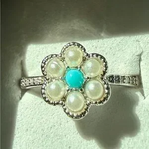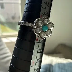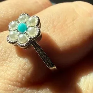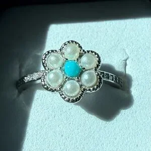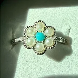 NEW! Pretty Bird Jewelry Flower Ring with Turquoise Center and Pearl Accents