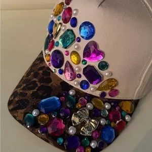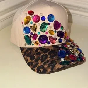 Eye-catching women's baseball cap with multicolor gem embellishments. Leopard-print brim and ivory crown create a bold contrast. Decorative jeweled accents and faux pearls add glamour. Lightweight and stylish for everyday wear.