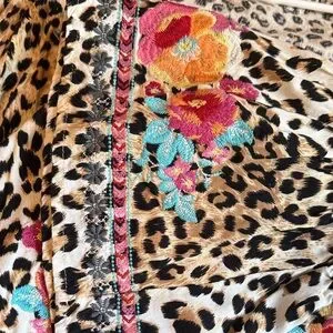 Chic leopard blouse with colorful floral embroidery. Features vibrant patterns and a relaxed fit. Size 2X Bust 52 Length 31