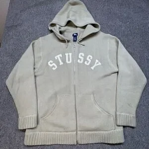 Keywords: Stussy hoodie, knit sweater, mens streetwear, full zip, graphic hoodie, casual wear, lounge wear, outerwear, fall fashion, winter style, comfort, iconic logo, street style