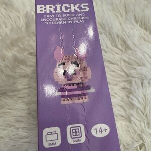 Purple and pink pixel bunny building set. Includes 135 pieces. Cute block-style collectible. Great for display or gifting.