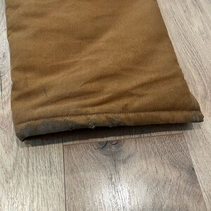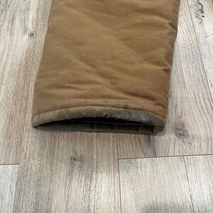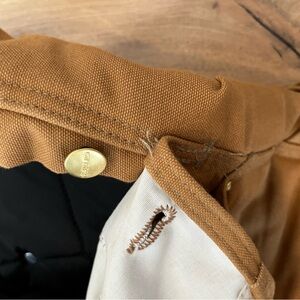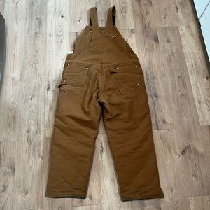 Sturdy Carhartt duck overalls with multiple utility pockets. Reinforced seams and rivets for durability. Adjustable shoulder straps with metal hardware. Classic brown workwear style for tough jobs.