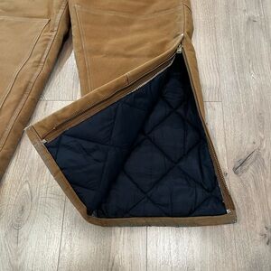 Zippered fly and zippered legs to allow fit over work boots. Plenty of pockets to stow your gear. Some wear visible on cuffs of pants legs and seams where button closures are, price reflects this.
