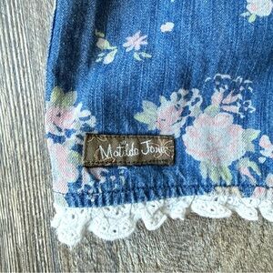 Matilda Jane floral denim short overalls in excellent condition. Features soft lightweight denim, all-over floral print, lace trim hem, and adjustable straps. Super cute boutique piece perfect for spring and summer styling.