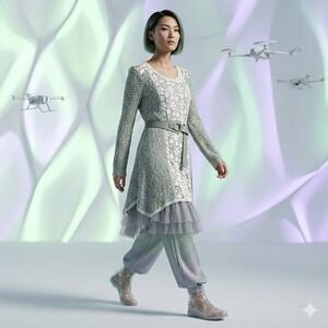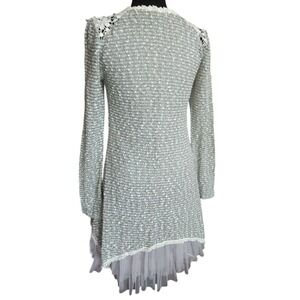 Designed By Ryu Mixed-media tunic dress blends a cozy sage green bouclé knit with delicate floral lace paneling and a whimsical tiered tulle hem. Designed with a classic scoop neckline and long sleeves, this piece offers a romantic, layered look in a single garment. The bodice features intricate white crochet-style floral lace down the center and at the shoulders, while the skirt finishes with a soft, pleated mesh ruffle.