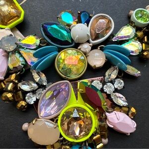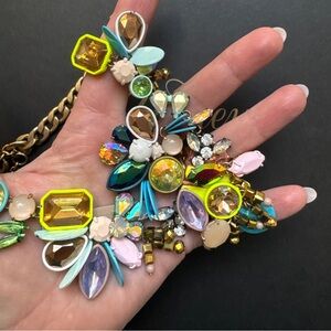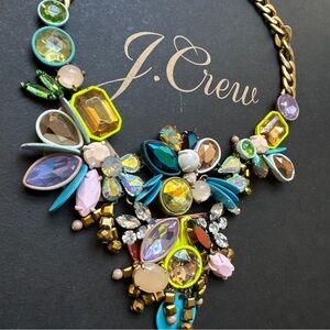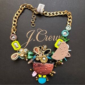 This is a J.Crew "Vintage Brûlée" statement necklace featuring multicolored faceted crystals and enamel accents in a gold-plated