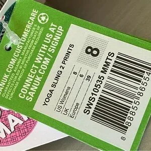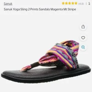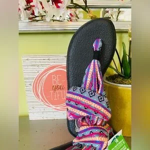 Sanuk sandals with wrap-style fabric straps. Available in multicolor orange , light blue, and purple-tones. Soft black footbeds from yoga mats. Easy slip-on, Boho vibe.