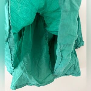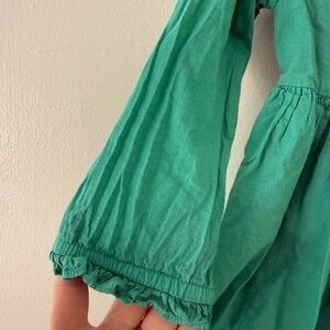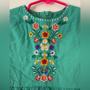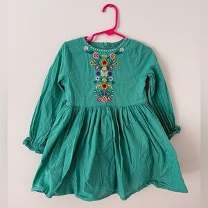 Adorable teal long sleeve dress with colorful floral embroidery. Long sleeves and gathered waist. Lightweight and perfect for spring!