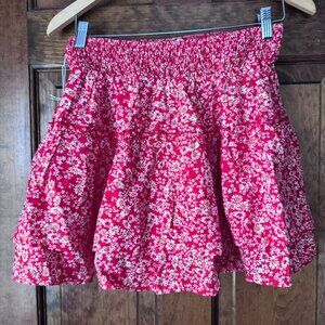 New with Tags; Sienna Sky; Skirt w/Hidden Shorts; Red; Large; 2.25" Smocked Waist Band; Flared Ruffled Skirt; Red Hidden Shorts; Self: 80% Nylon & 20% Rayon; Lining: 100% Polyester; Hand Wash & Line Dry; Skirt: Waist 14"; Length 19"; Shorts: Rise 9"; Inseam 1.5"; Leg Opening 14"
