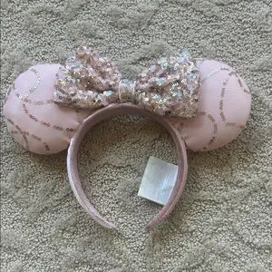 Sparkling pink sequin bow headband minnie ears. Soft pink ears with matching sequin bow add playful shine. Comfortable padded headband for everyday wear and special outings.