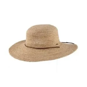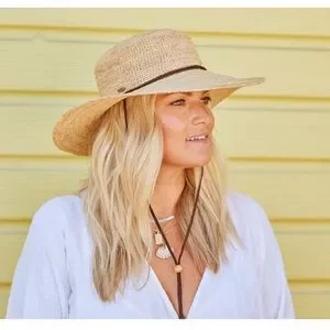 Chic straw hat by Scala. Features a stylish brown band. Perfect for sunny days.