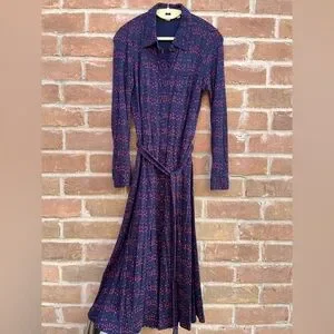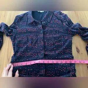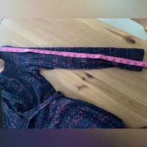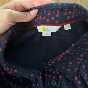 Size 6 Long. In like new condition. Navy Blue and Red. Long sleeves. Button down. Tie waist. It has pockets! Super soft. Measurements and fabric tag in the pictures.