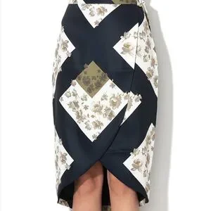 Elegant pencil wrap skirt with geometric floral design. Features navy/olive/ivory tones. Ideal for stylish events.