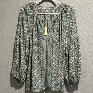 Max Studio peasant tunic in green and white geometric print. Split neckline with tie closure. Three-quarter puff sleeves with elastic cuffs. Lightweight, breathable fabric for easy wear.