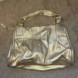 Cole Hann Gold Leather Handbag Purse Zipper Pockets Tassel Organize Wide Strap