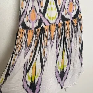 White with pink, green, purple Aztec pattern all over. Strapless with cut out back. Ruched back with tie in back. Sweetheart bodice with flowy, tiered skirt.