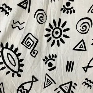 Allover novelty print of sun, fish, eyes, evil eyes, shapes
