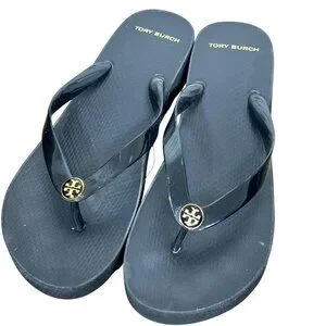 TORY BURCH Women's Thandie Wedge Medallion Flip Flops Black Sz 11 EUC