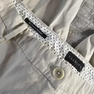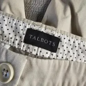 Talbots capri pants in a versatile beige color. Features button details at the leg hems for added style. Size 14 Petite with a 'Perfect Slimmer' fit for a flattering silhouette. Comfortable and suitable for casual or business casual wear.