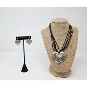 Silver Tone Layered Heart Necklace Earrings Set Multi-Strand Clip On Boho