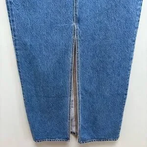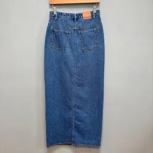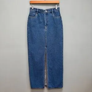 This skirt is crafted of rigid Italian denim in a maxi-length cut. This style is complete with a front skirt slit.